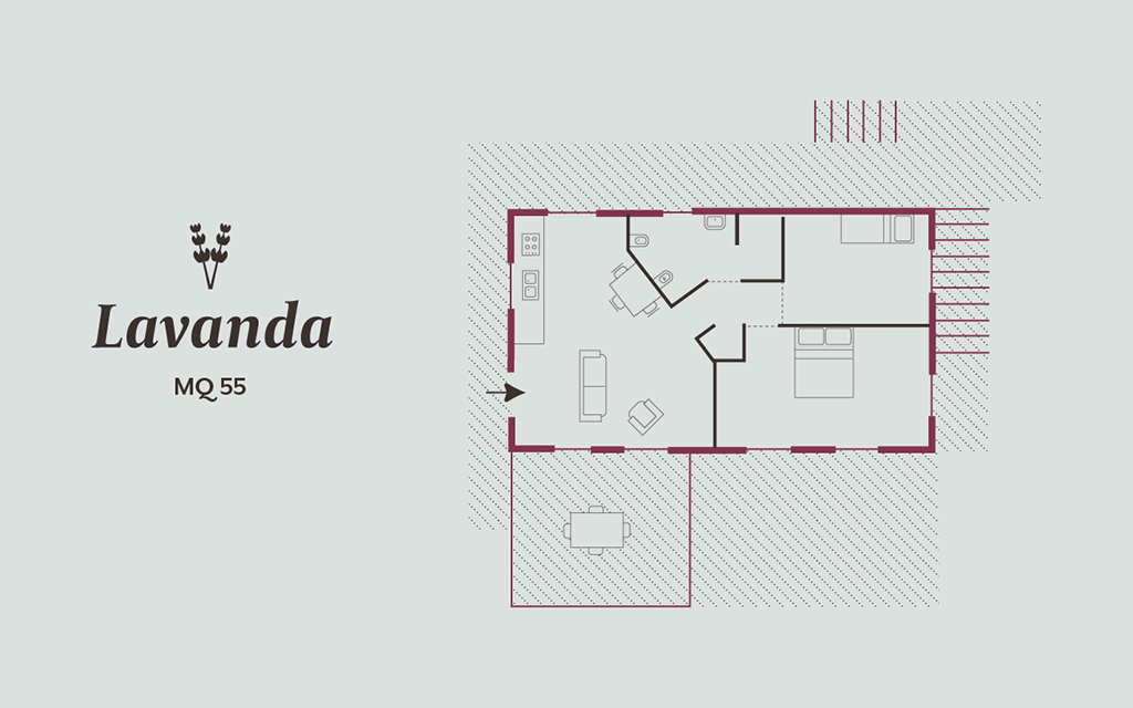 Lavanda is laid out on one floor. This house features a living room with kitchenette and fireplace, a double bed-room, a single bedroom and one bathroom. The Lavanda house overlooks the garden and features an equipped patio, perfect during warm seasons for enjoying outdoor meals in complete privacy.